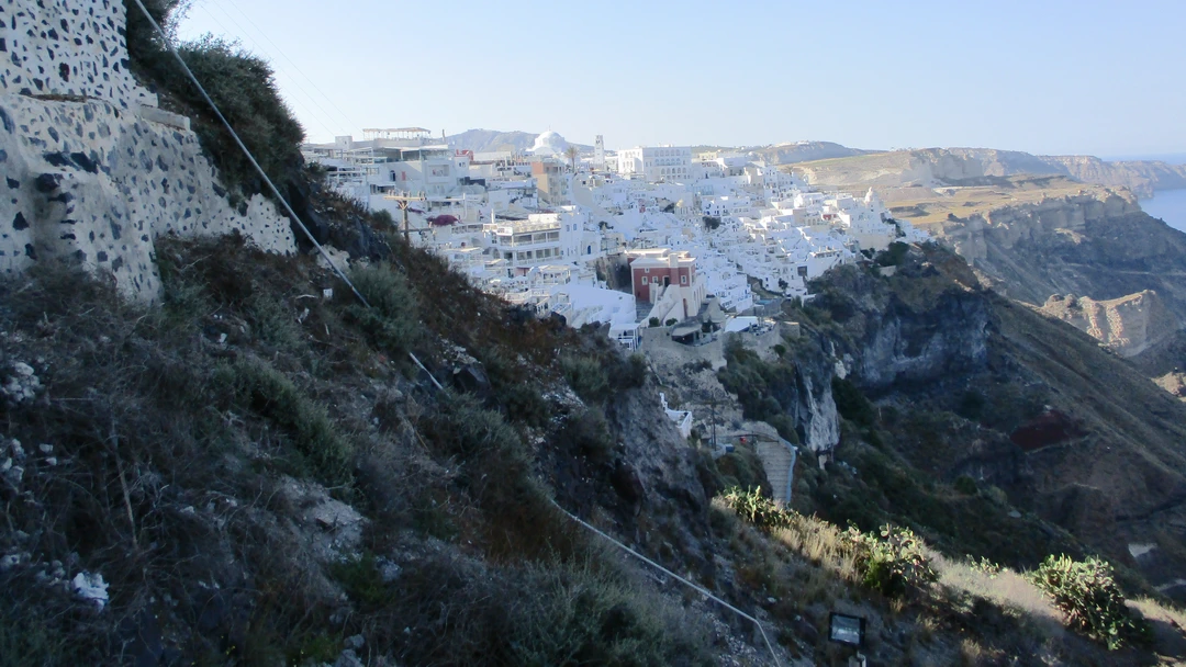 Arriving at the dock it’s very quiet at the moment with no other boats in as yet. We’re given a choice, ride a donkey or walk up the cliff path or take the cable car for €6 per person each way. Clearly we took the cable car. From here you get the amazing first views of the caldera.