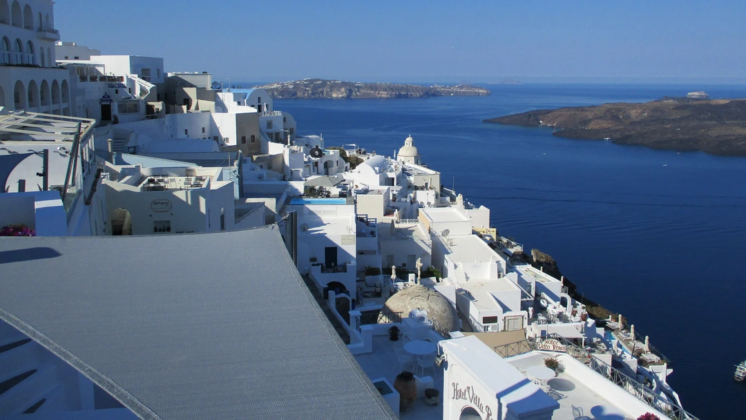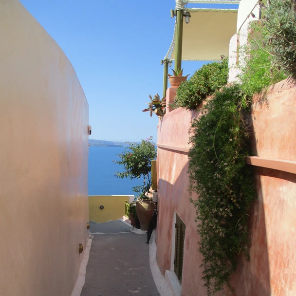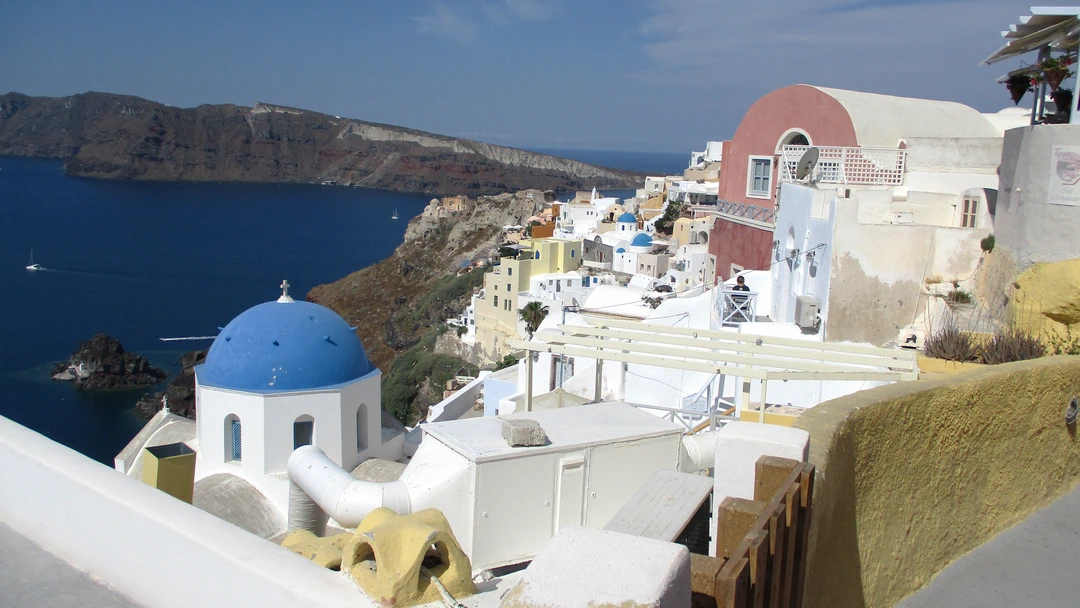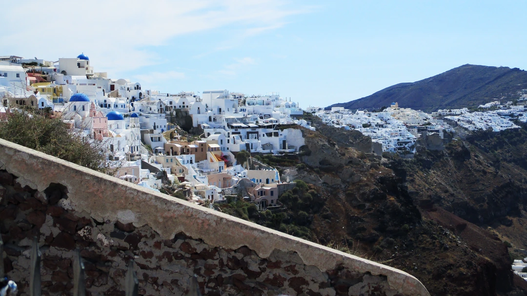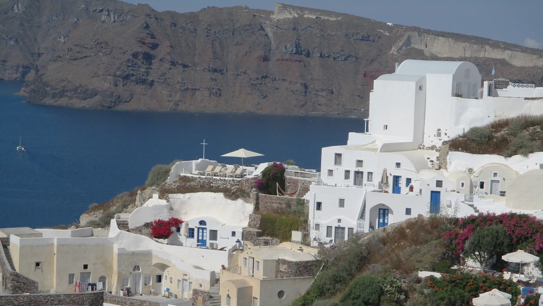 Work up this morning as we’re heading into to caldera of Santorini. From down at sea level it looks as if there are clouds or snow on the crest of the caldera. But it is the bright white houses of the villages of Santorini.